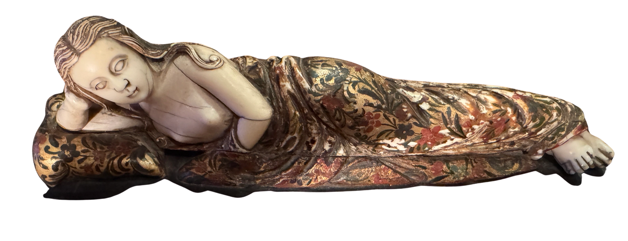Wood & gesso sculpture with ivory body depicting a recumbent Saint Mary Magdelaine with polychrome decoration. Hispano-Filipino, Sangley work, c.1700.